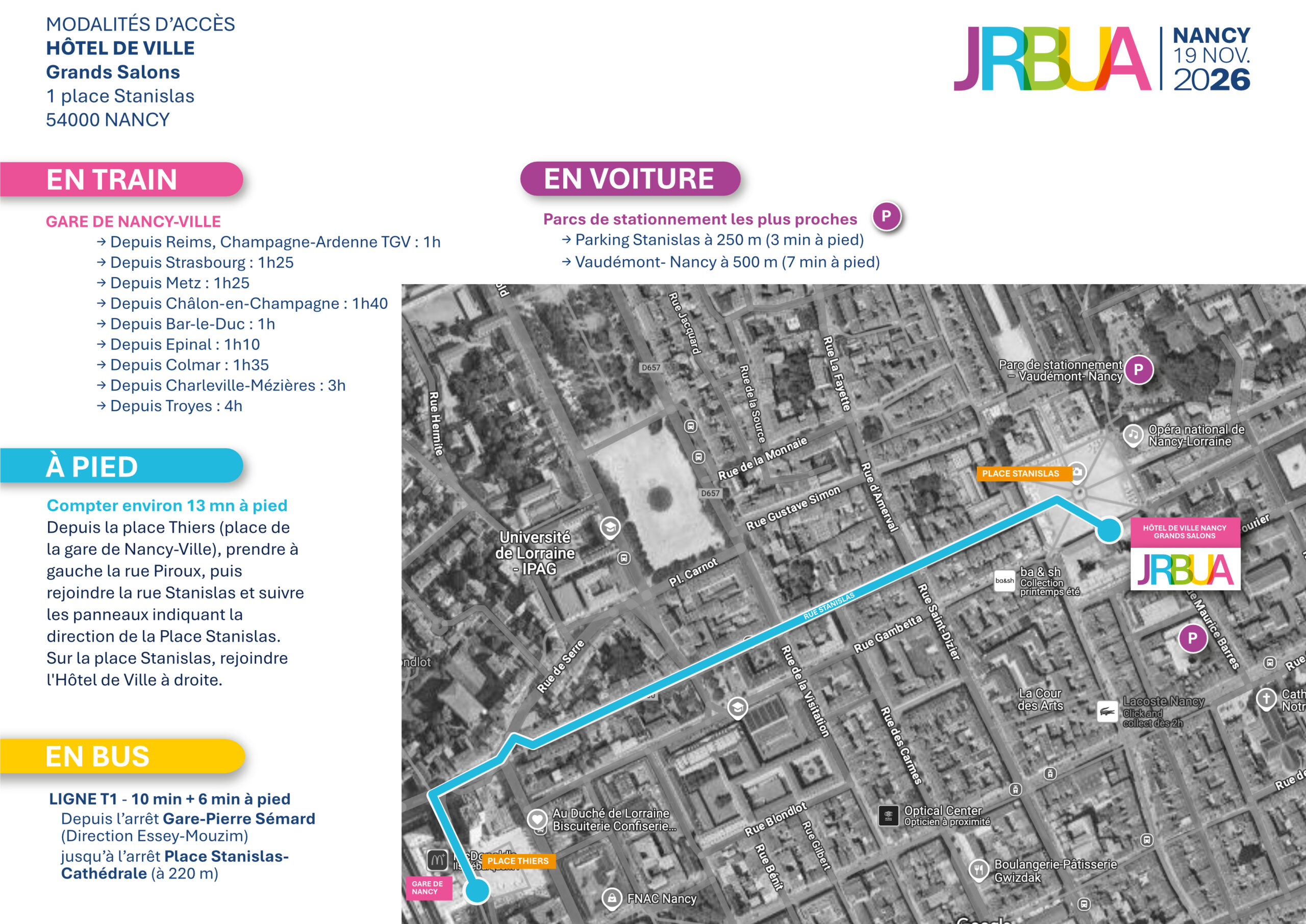 Les Grands Salons de l’Hôtel de Ville sont accessibles depuis la place Stanislas. Un plan illustré (voir ci-dessous) vous indiquera comment y accéder, que vous arriviez en train, en voiture ou à pied.